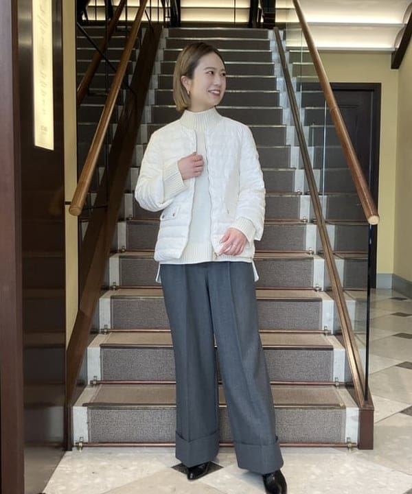 やや短めの袖丈とノーカラーデザインが華奢な印象と上品な女性らしさを演出します。
