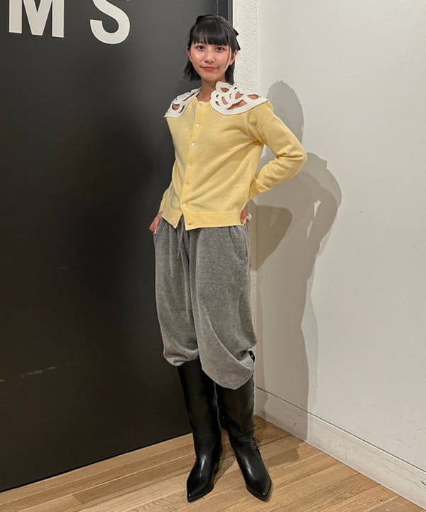 〈MIYAO〉のアーカイブから、カットアウトディテールのニットをベースにカーディガンを作成した、デザイン別注アイテム。襟のようなショルダーデザインがポイントです。前後どちらでも着られる2WAY仕様で、気分やスタイルに合わせて楽しめます。