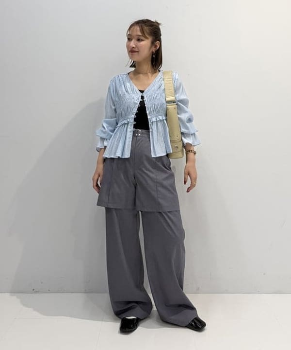 パンツの独特なシルエットを際立たせるため、トップスをウエストインしてベルトラインを見せる着こなしがおすすめ。ボリュームのあるボトムスの足元に、あえてパンプスで抜け感を出すことで、スッキリと洗練されたバランスに仕上がります。