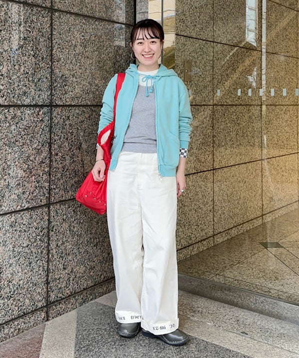 着丈が短めのため、ボリュームのあるボトムスともバランスがとりやすいサイズ感です。